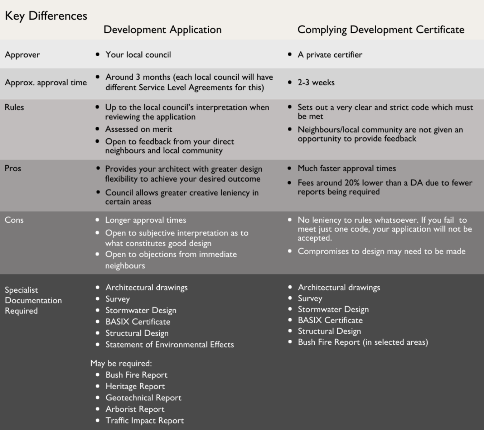 While each option presents its own pros and cons, the two main differences between these are: Speed of approval, and Level of design plan flexibility. Either way, a DA or CDC must be lodged and have approval granted by the respective entity before any building work can commence on your project.